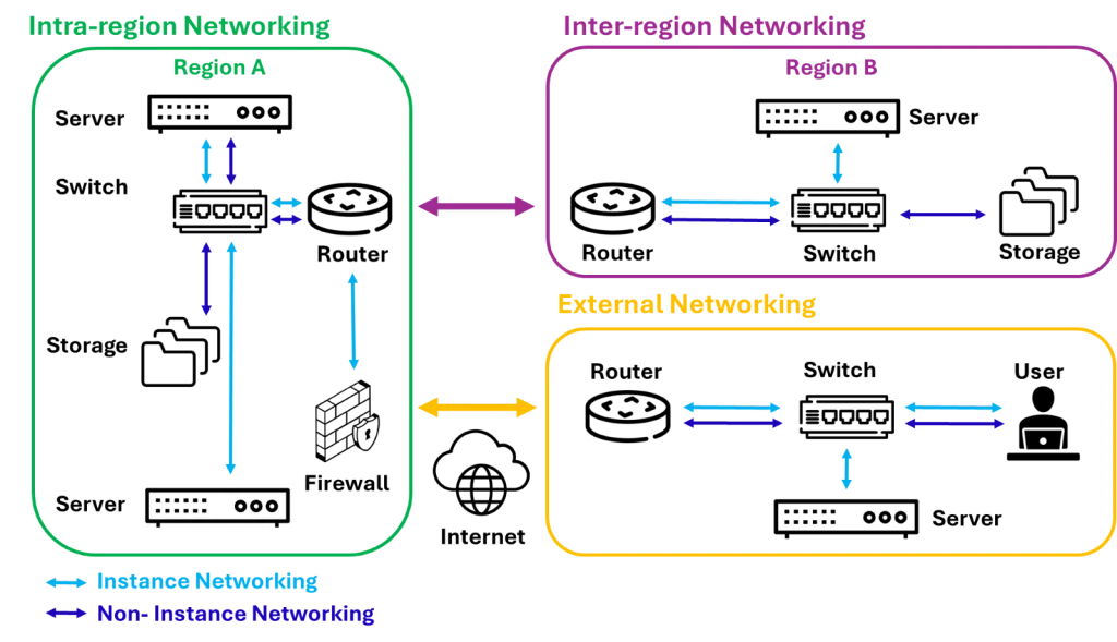 - Intra-region networking: data transfer within one Cloud Service Provider (CSP) region, for example from Ireland to the UK.